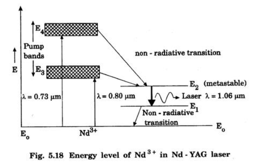 - Pumping: Flash tube light ($0.73 \mu m$, $0.80 \mu m$) excites $Nd^{3+}$ ions from ground state $E_0$ to pump bands $E_3$ and $E_4$.