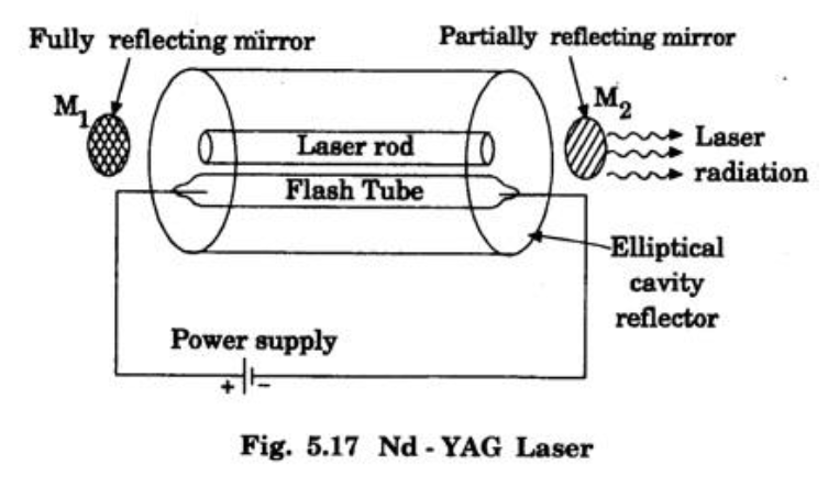 - Active Medium: Yttrium Aluminium Garnet ($Y_3Al_5O_{12}$) crystal rod where some Yttrium ions are replaced by Neodymium ($Nd^{3+}$).