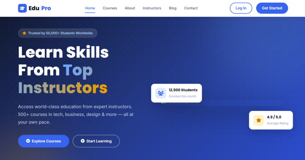 - 6 Full-Featured Pages: Home, Courses, About, Instructors, Blog, and Contact.